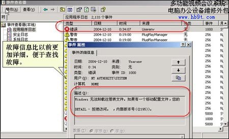 在進(jìn)行上述修改前,事件查看器具有較低的查看級(jí)別,一些事件不會(huì)被記錄下來。修改后,可以更詳細(xì)地了解系統(tǒng)狀況。當(dāng)Windows 2000關(guān)機(jī)速度緩慢時(shí),只要進(jìn)入“開始→控制面板→管理工具→事件查看器”,點(diǎn)一下“應(yīng)用程序日志”,這時(shí)就會(huì)看到詳細(xì)的故障信息,(如圖2)。