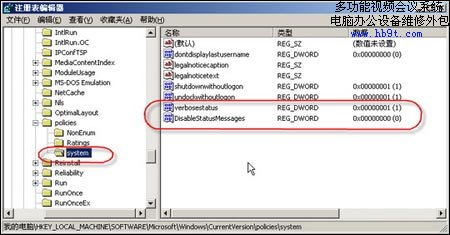 第一步:打開注冊(cè)表編輯器,找到[HKEY_LOCAL_MACHINESOFTWAREMicrosoftWindowsCurrentVersionpoliciessystem],在里面建立一個(gè)名為“verbosestatus”的DWORD值,然后將它值設(shè)為1。